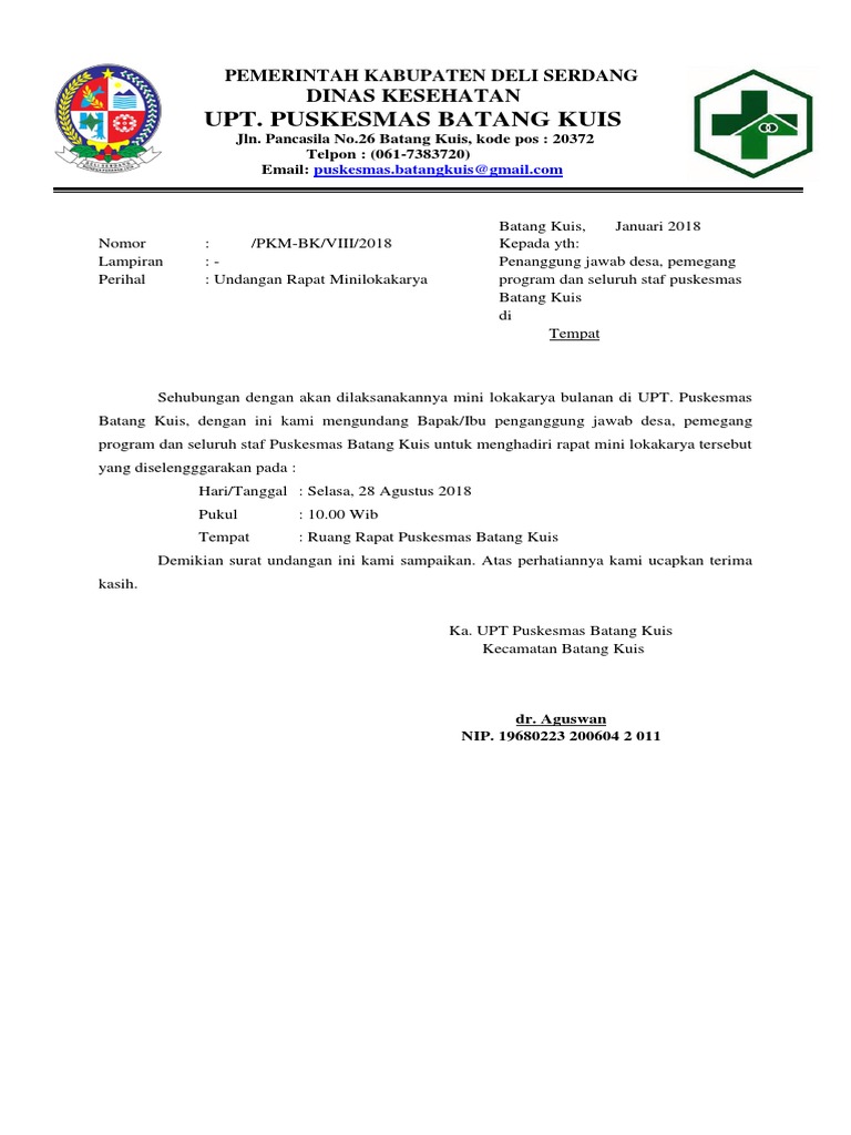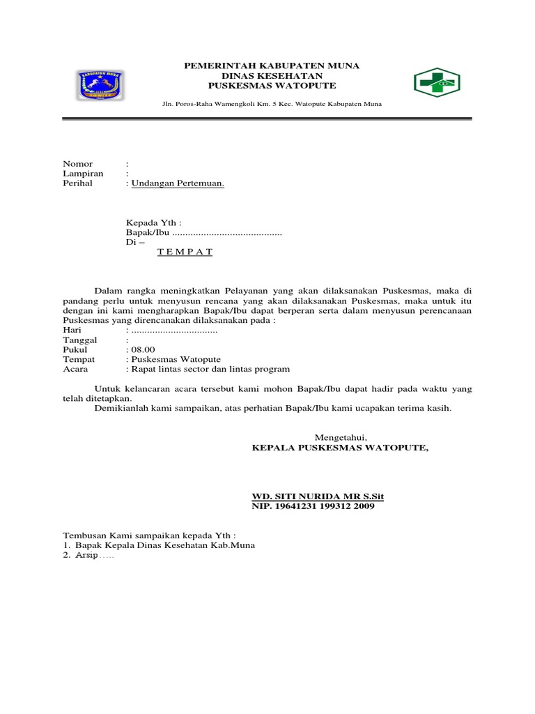 58 Contoh Undangan Rapat Puskesmas Terbaru Contoh Undangan from imgv2-2-f.scribdassets.com Sebagaimana penulisan surat dinas resmi, maka penulisan surat dinas kesehatan harus sesuai dengan standar dan eyd (ejaan yang disempurnakan. Dapat menjadi bukti dalam membuat suatu surat perjanjian yang dibutuhkan perusahaan atau lembaga untuk kepentingan dinas. Secara umum fungsi surat undangan adalah sebagaimana tercermin dalam rumusan pengertiannya yaitu sebagai alat komunikasi tertulis untuk menyampaikan pesan atau informasi. Contoh surat undangan rapat rt. Sebuah perusahaan biasanya mengadakan rapat dalam satu periode tertentu untuk membahas suatu. Surat dinas undangan rapat di perusahaan. Contoh surat undangan rapat perusahaan. Contoh surat undangan rapat sekolah.