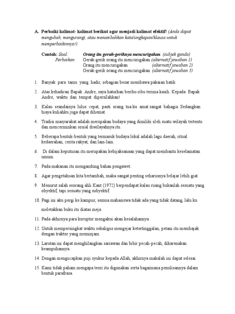 Pilihlah salah satu jawaban yang dianggap paling tepat dengan memeberi tanda silang (x) pada huruf a,b, c, d, atau e! Kenaikan harga sembako membuat rakyat menjerit. Dalam menyampaikan gagasan menggunakan kalimat efektif ini mahasiswa diharapkan mampu memahami pemakaian kalimat efektif dalam kalimat dan paragraf. Pengertian kalimat efektif kalimat efektif adalah kalimat yang mengungkapkan pikiran atau gagasan yang disampaikan sehingga dapat dipahami dan dimengerti oleh orang lain. Contoh soal kalimat efektif kunci jawaban ruang seni kumpulan soal essay tentang kalimat efektif, 07 09 2019 contoh soal kalimat efektif kunci jawaban soal soal diperlukan untuk terus mengasah kemampuan kita terutama ketika dilaksanakan ujian berikut adalah contoh soal kalimat.